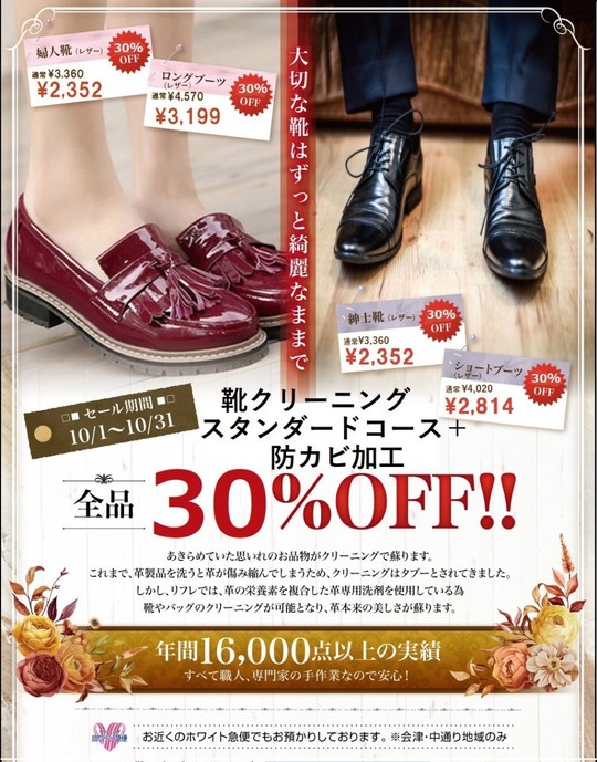靴クリーニング「スタンダードコース+防カビ加工」が全品30%OFF!!