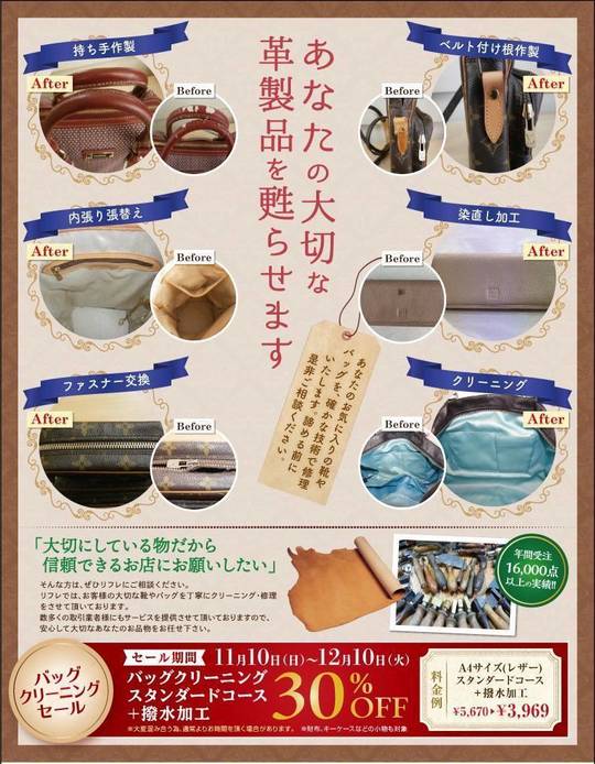 バッグのクリーニングがお得に‼しかも撥水加工込なので、汚れ防止や突然の雨からも守ってくれます(^_-)-☆革製品に限らず、ナイロンや布などすべての素材に対応可能ですので、迷った際にはご相談だけでもOKです(^^)v