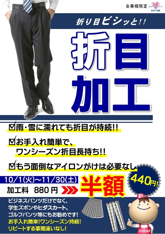お手入れがとっても楽になりますよ(^_-)-☆ビジネスパンツはもちろんのこと、学生服にもおすすめなので是非一度いかがでしょうか(^-^)ビシっとした折目で、足長効果も期待できます(^^)v